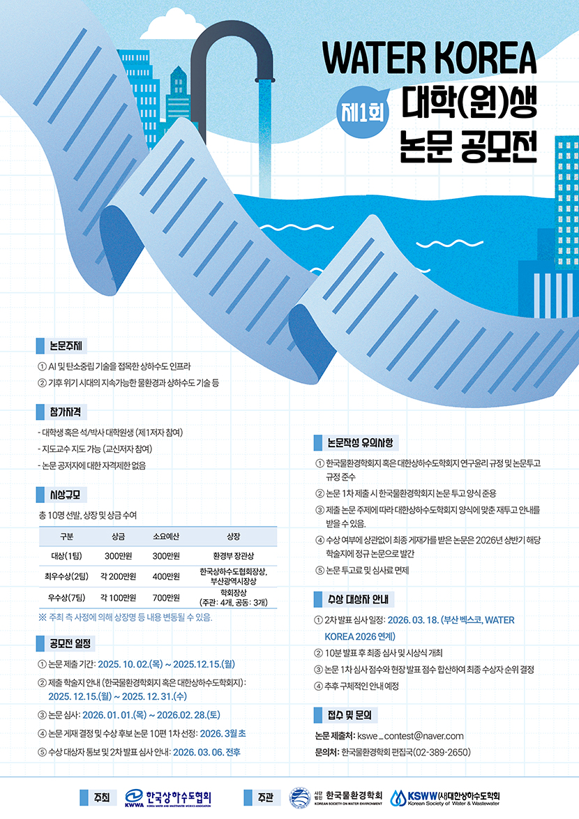 제1회 WATER KOREA 대학(원)생 논문 공모전을 개최할 예정입니다.